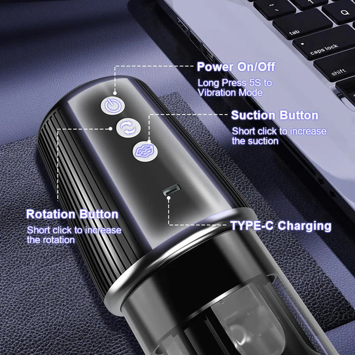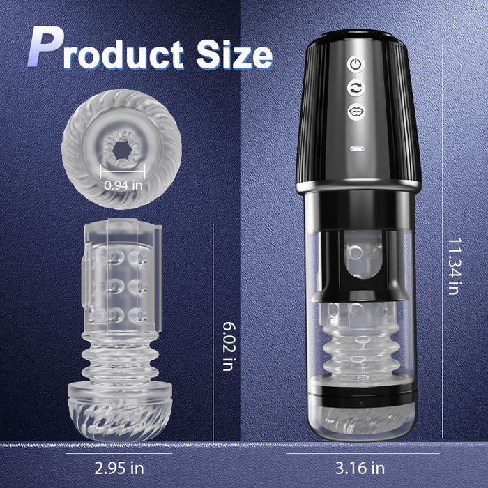 Multi-Dimensional Pleasure: Dive into a sea of ecstasy with 5 rotating, 5 sucking, and 7 vibrating modes. Whether you crave a singular sensation or a symphony of stimulation, this masturbation cup adapts to your desires, offering a spectrum of pleasure experiences. Dual-Purpose Design: Elevate your solo play and training sessions with powerful suction capabilities. This 2-in-1 marvel not only delivers intense pleasure but also aids in enhancing endurance, blending enjoyment with performance improvement. Triple Motor Power: Equipped with an N20 vibration motor, a 370 air pump, and a dedicated rotation motor, our device guarantees stability and strength in function. Experience the relentless power and precision that takes your pleasure to new peaks. Luxurious Silicone Sleeve: Immerse yourself in the indulgence of a silicone inner sleeve featuring a 0.98-inch thick entrance and 3-tiered texture for a massage that feels as real as it gets. The soft, comfortable embrace of our device offers an authentic experience designed to satisfy. Visual Excitement: Catering to your voyeuristic desires, the transparent cup allows you to witness the action. With three easy-to-use buttons, control is at your fingertips, making it effortless to navigate through modes and find your perfect setting.